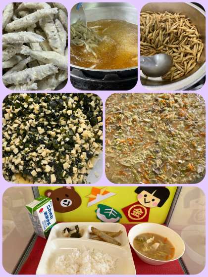 今日の給食献立は『きびなごてんぷら、豚汁、わかたけ煮、ごはん、牛乳』でした。