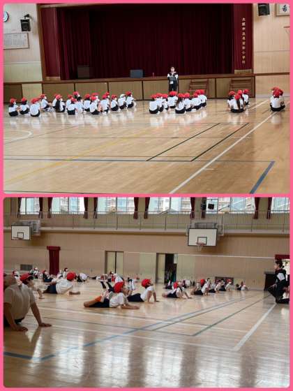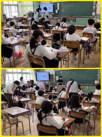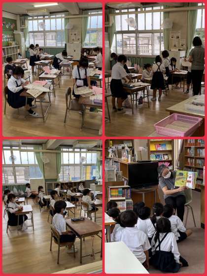 1年生、1組さんはプリントをファイルに綴じることに奮闘中。「あれ?うまくいかない」「どうするの?」あちらこちらで助け合いも見られました。2組さんは図書館補助員からの読み聞かせ。目をキラキラさせながら本の世界に入っていました。