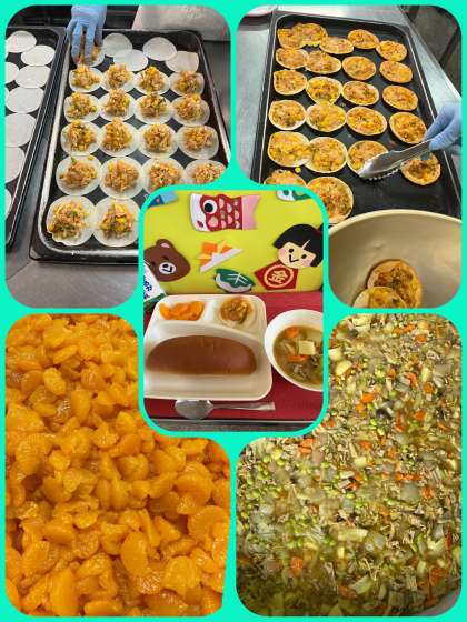 変わりピザは、混ぜた具材を一枚ずつピザの皮にのせて焼き上げます。調理員さんにとっては大変な作業ですが、その分、子どもたちも大好きな献立です。今日もおいしかったです。ごちそうさまでした。