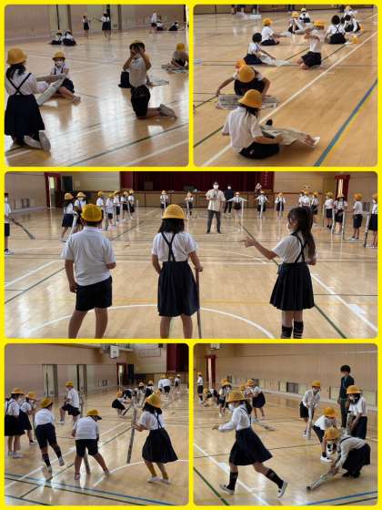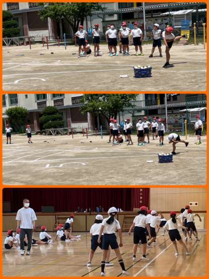 明日が遠足のため、体操服はなしの3年生。新聞紙で作った円筒で活動していました。お隣さんの円筒を倒れる前にキャッチします。耳をすまして合図をよく聞いて、、、「ピッ」「ぎゃー」何をしても楽しそうな3年生です。