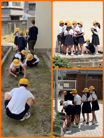 4年1組のみなさんも苗の観察と雑草抜きを。ありがとう!