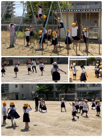 昼休みのようす。1年生はクラス遊び。1組はドッチボール、2組はのぼり棒。みんな元気です!すばらしい!