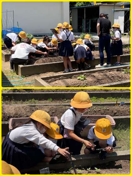 3年1組理科「植物の育ちとつくり」の学習。タブレット端末で撮影し、定規で苗の伸びを測っていました。
