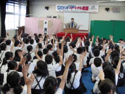 「話を聞くお稽古の時間」というめあてで、小噺や落語聞きました。伝統文化の雰囲気を味わい、児童も小噺やおはやしの体験をすることができました。子どもたちの感想の中には、「テレビみたいに映像じゃないのに、自然にトラやライオンが頭に浮かんできて、落語家さんの話し方がうまいからなんだろうなと思いました。」などの感想があり、楽しく学ぶことができました。