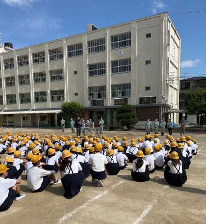 まずは避難訓練。きまりを守って訓練できました。