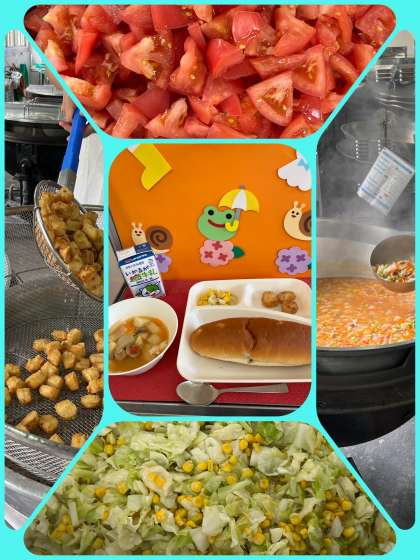 今日の給食献立は、『いかてんぷら、フレッシュトマトのスープ煮、サワーソテー、おさつパン、牛乳』でした。