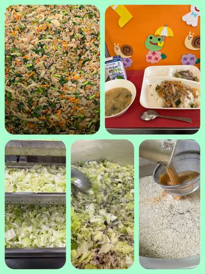 今日の給食献立は、『豚ひき肉とにらのそぼろ丼、みそ汁、キャベツの赤じそあえ、牛乳』でした。