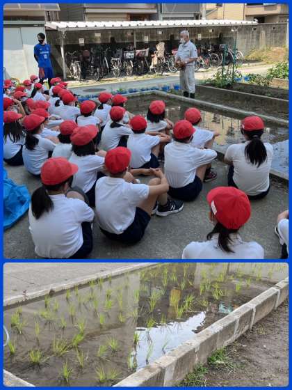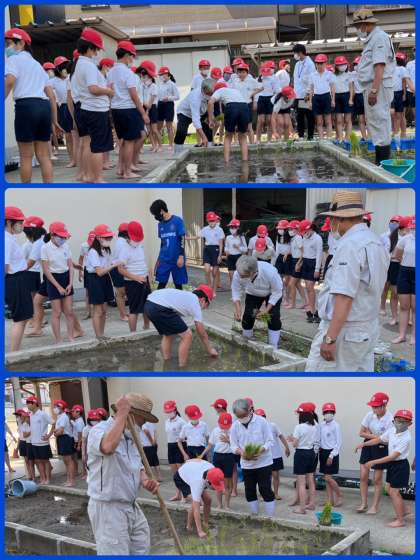 本校の特色ある取り組みの一つである5年生「田植え」。地域の村井さんをゲストティーチャーとしてお越しいただき、今年の5年生も取り組むことができました。素足で泥の中に入る経験も初めての子がほとんどで戸惑う様子も見られましたが、全員が「苗を植える」という貴重な経験をすることができました。よかったね。