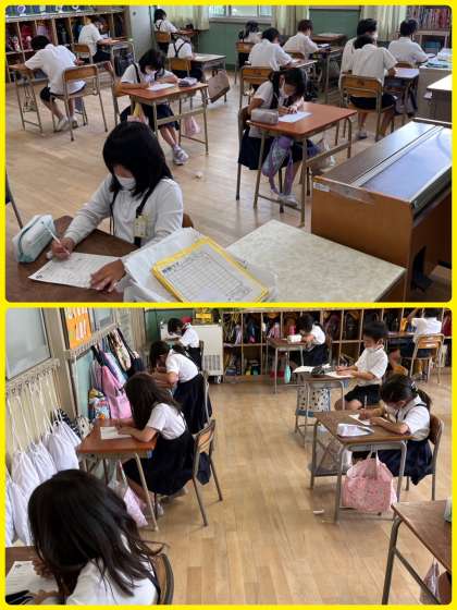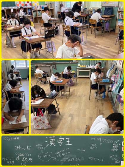 今日の『漢字王』は3年1組と2組がチャレンジ。2クラスとも開始前に確認すると「もうちょっとドリル見たい」という人が数人。少し自信がないような…。
