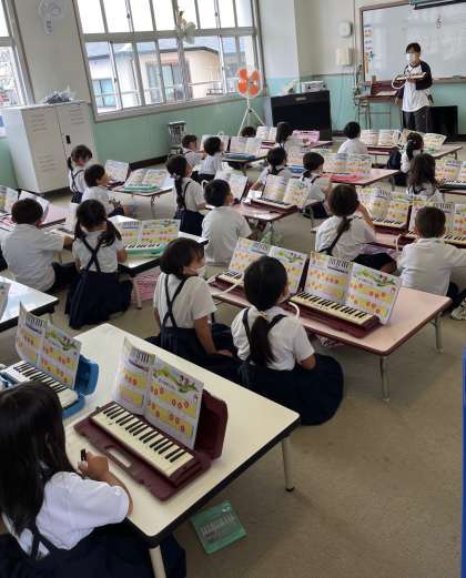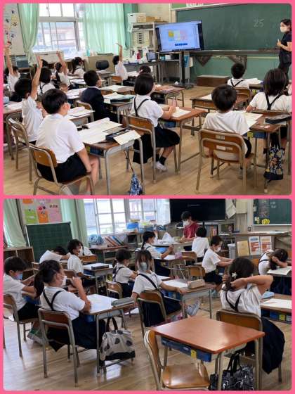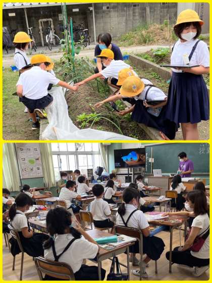 3年1組理科の学習は、テストが終わった人から、タブレット端末を持って学習園に。「植えたときは、めっちゃ小さかってん!」と説明もしてくれました。教科書だけでなく、こうして実際に見て学ぶ学習も本当に大切だなぁと、改めて。