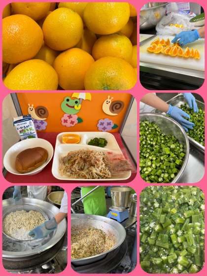 今日の給食献立は、『和風焼きそば、オクラの甘酢あえ、オレンジ、1/2パン、牛乳』でした。