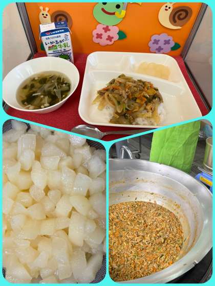 今日の給食献立は、『和風カレー丼、すまし汁、和なし(カット缶)、ごはん、牛乳』でした。