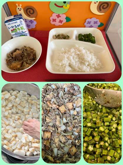 今日の給食献立は、『すき焼き煮、オクラのかつお梅風味、もやしとピーマンのごまいため、ごはん、牛乳』でした。