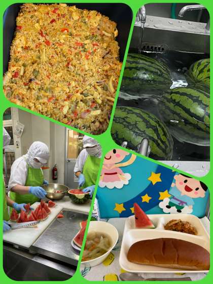 今日の給食献立は、『パエリア、ウインナーとキャベツのスープ、すいか、黒糖パン、牛乳』でした。