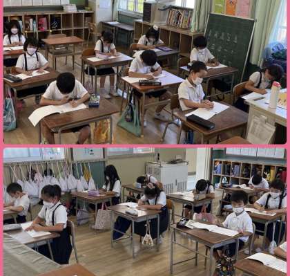 今日は2年2組が「漢字王」にチャレンジしました。「ゆっくりていねいに」の話の通り、名前からていねいに書いていました。結果もすばらしかったです。よくがんばりました!