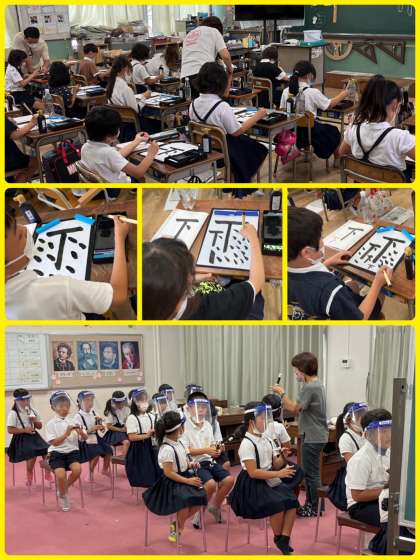 3年1組のみなさんが習字の学習に取り組んでいました。1枚の半紙に何度も何度も「下」の字を練習していました。