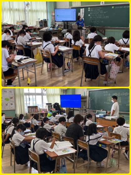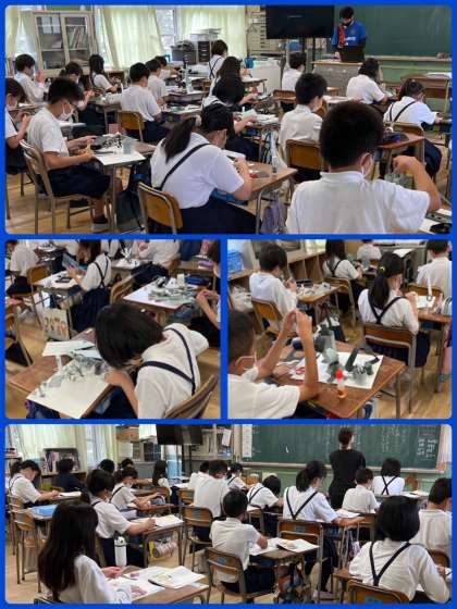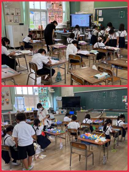 5年1組図工の学習。画用紙を切ったり、貼ったり、重ねたり、編んだり…。どんな作品ができあがるか、楽しみにしておきます。
