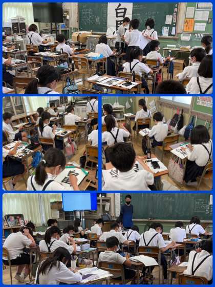 5年1組は習字「白馬」に取り組んでいました。一画一画ていねいに書く子どもたち。えんぴつで書くようにはいかず、何度も練習する人も。そういう姿勢が大切です。