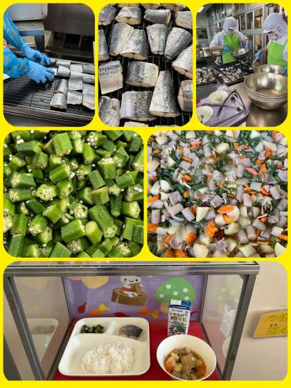 今日の給食献立は、『さごしの塩焼き、豚肉とじゃがいもの煮もの、オクラのいためもの、ごはん、牛乳』でした。