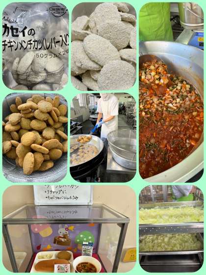 今日の給食献立は、『チキンレバーカツ、ケチャップ煮、キャベツのバジル風味サラダ、コッペパン、りんごジャム、牛乳』でした。
