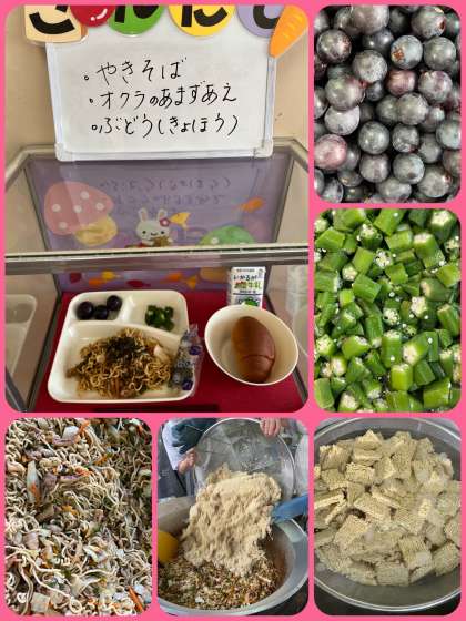 今日の給食献立は、『焼きそば、オクラの甘酢あえ、ぶどう(巨峰)、1/2パン、牛乳』でした。