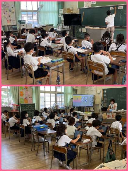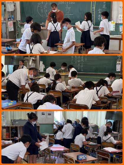 4年生算数はテスト直し。あちらこちらで教え合いが見られました。教えてもらう人は間違いがわかり、教える人は説明することでさらに理解が深まります。これからも教え合い学び合い、続けていきましょう。