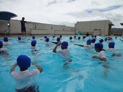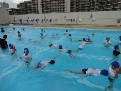 プールで着衣泳の学習をしました。服を着たまま浮いたり泳いだりしました。普段の水着とは違う抵抗感があることに驚いていました。