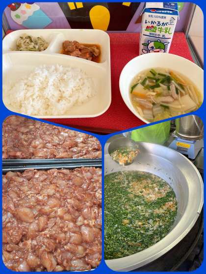 今日の給食献立は、『鶏肉のチリソース焼き、焼き豚とワンタンの皮のスープ、切干しだいこんのごま辛みづけ、ごはん、牛乳』でした。