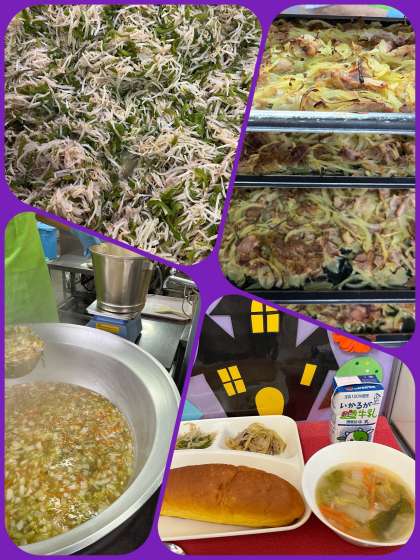 今日の給食献立は、『豚肉のカレー風味焼き、はくさいのスープ、もやしとピーマンのいためもの、パンプキンパン、牛乳』でした。