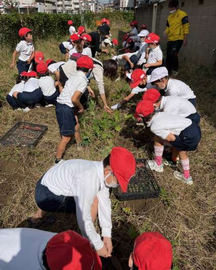 「おおきいのがほれた!」、「ちいさいかった」「きゃー、ようちゅうが〜」…、いろいろとありましたが、まわりの友だちと協力しながら、掘っていました。