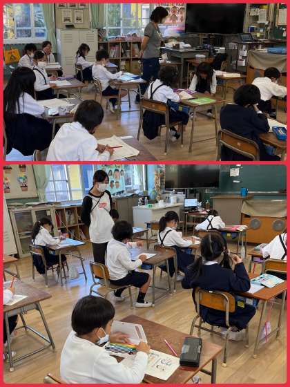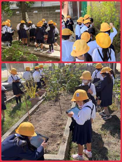 タブレット端末を持って、学習園や校長室裏の小径にやって来た1年生。葉っぱや実などを見つけて、写真をたくさん撮っていました。どんな学習につながっていくのかな?楽しみです。