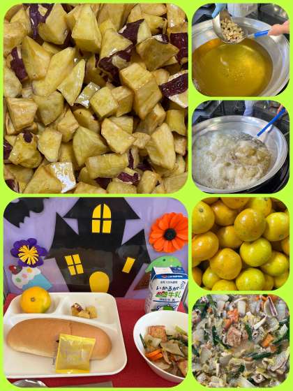今日の給食献立は、『豚肉といかの中華煮、大学いも、みかん、コッペパン、アプリコットジャム、牛乳』でした。