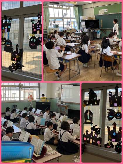 2年生が図画工作の学習で取り組んでいたハロウィンの飾りができあがっていました。お日さまの光でさらにきれいな飾りになっていました。よくがんばりましたね!
