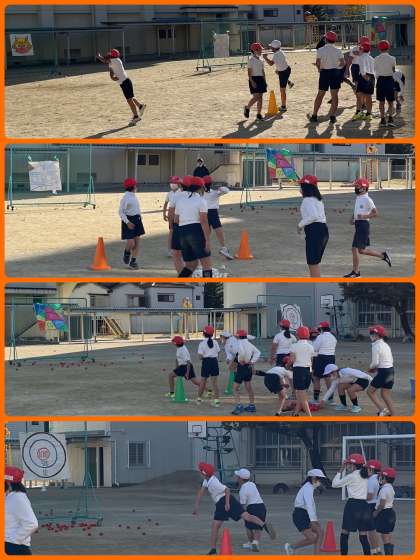 4年生は体育。自分のめあてにあった場所で、的に向かって投げていました。苦手な人も焦らず、コツコツと練習していきましょう。