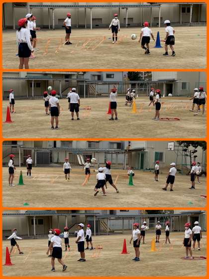 1年生はコーンを回ってバトンを渡す「リレー遊び」。4年生は「プレルボール」。