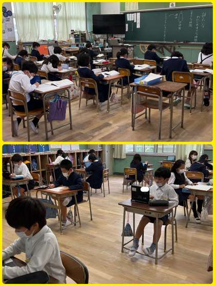3年2組のみなさんがタブレット端末を持ってウロウロ。図工の作品づくりのようです。楽しみにしておきますね。