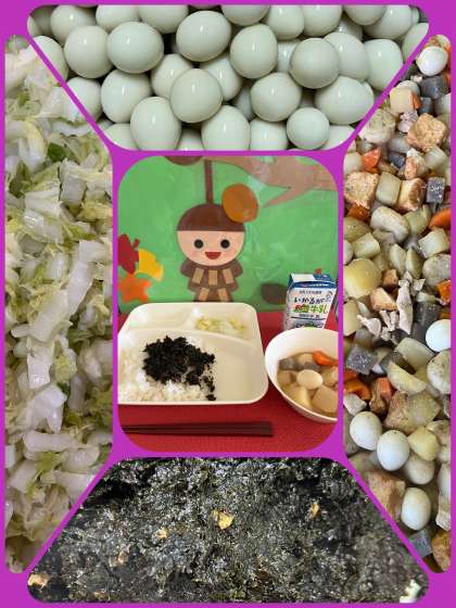 今日の給食献立は、『関東煮、はくさいの甘酢あえ、のりのつくだ煮、ごはん、牛乳』でした。
