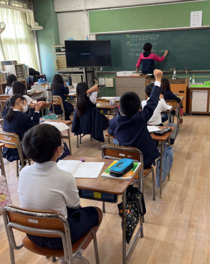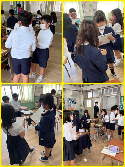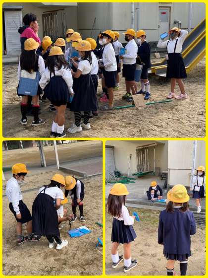 「光のせいしつ」の学習。今日は「はね返した日光を重ねたときの明るさと温度」を実験で調べていました。時々、日光が雲に隠れてしまうこともありましたが、温度計と鏡を使ってグループで役割分担しながら実験することができました。