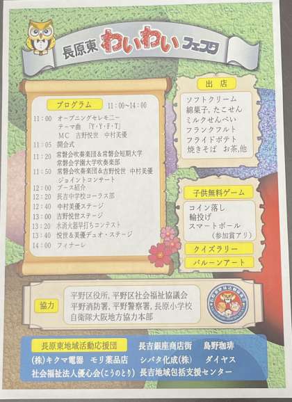 本日、長原小学校で行われる『長原東わいわいフェスタ』は11時から14時までです。