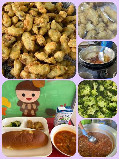 今日の給食献立は、『白身魚フリッター、ミネストローネ、ブロッコリーのサラダ、おさつパン、牛乳』でした。