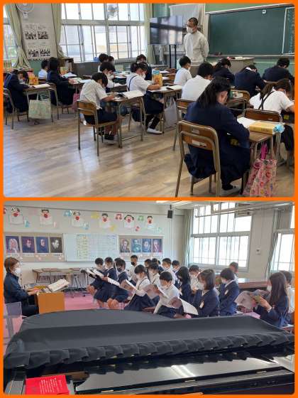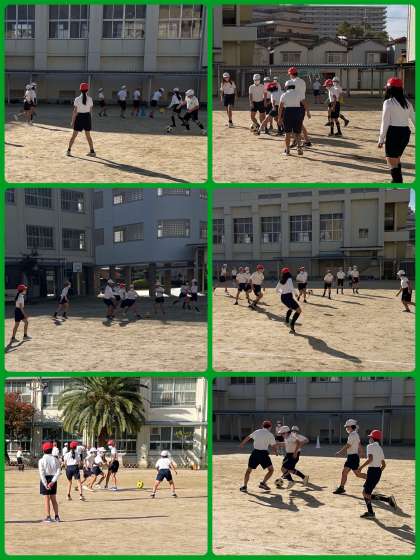 6年生体育は「2ゴールサッカー」。1コートにコーンを立てた4つのゴールが。攻守がめまぐるしく変わり、楽しく取り組んでいました。