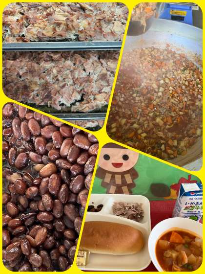 今日の給食献立は、『豚肉のガーリック焼き、ケチャップ煮、うずら豆のグラッセ、コッペパン、バター、牛乳』でした。