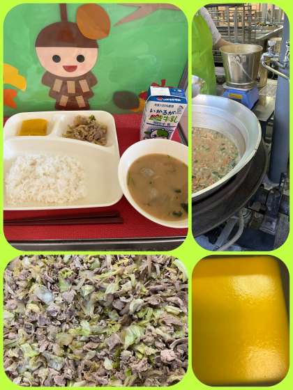 今日の給食献立は、『豚肉と野菜のいためもの、いわしのつみれ汁、かぼちゃういろう、ごはん、牛乳』でした。