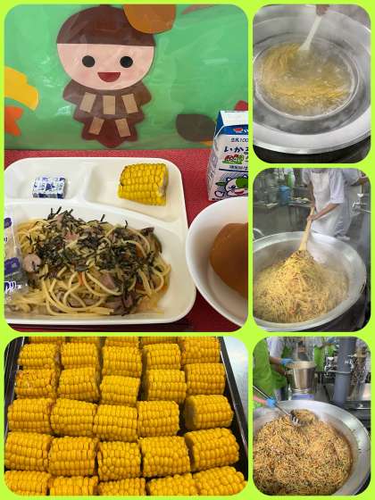 今日の給食献立は、『ウインナーときのこの和風スパゲッティ、焼きとうもろこし、固形チーズ、1/2パン、牛乳』でした。