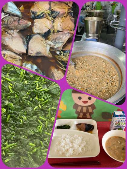 今日の給食献立は、『なまりぶしのしょうが煮、じゃがいものみそ汁、ほうれんそうのおひたし、ごはん、牛乳』でした。