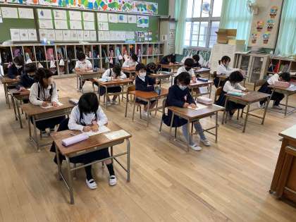1年生にとって2回目の漢字王。今日は2組がチャレンジしました。1回目よりさらにていねいに書けていました。今日まで何度も練習を重ねてきたようです。どんどん自信を持って学習をすすめてほしいです。よくがんばりました!