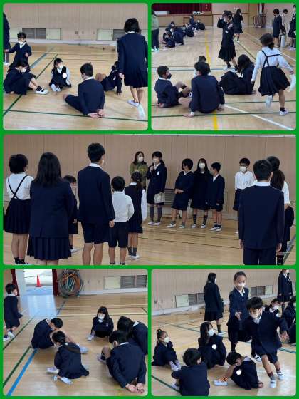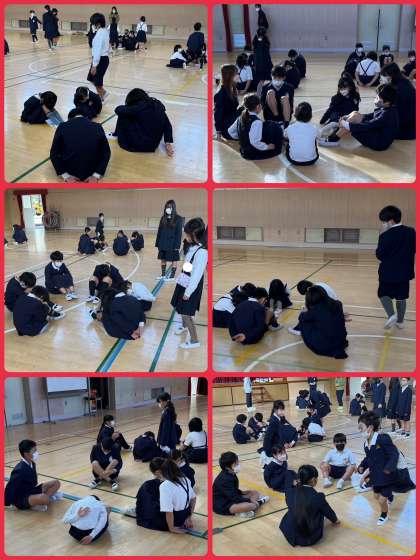 今日のペア集会は1年生と6年生ペア。遊びは「ハンカチ落とし」でした。ペア集会ルールは、ハンカチを落として、その場所に座るまでにタッチされたら、「大きくなったらなりたいもの」を発表します。