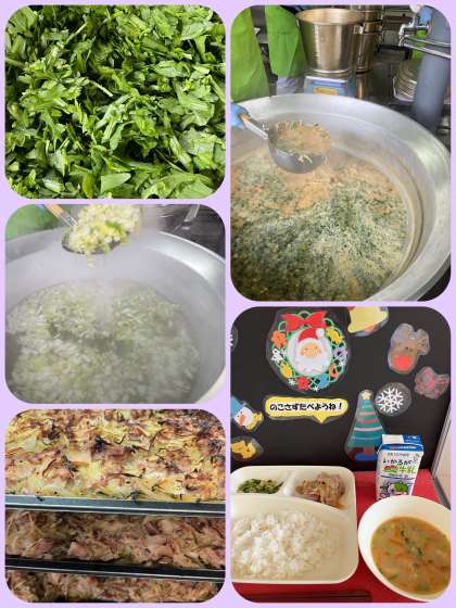 きくなとはくさいのごまあえは、旬のきくなとはくさいを合わせることで、子どもたちにも食べやすくなっていました。さつまいものみそ汁はさつまいもの甘みもあっておいしかったです。