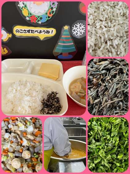 今日の給食献立は、『卵どうふ、一口がんもと野菜の煮もの、魚ひじきそぼろ、ごはん、牛乳』でした。