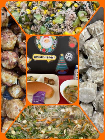 今日の給食献立は、『あげシューマイ、中華スープ、ツナとチンゲンサイのいためもの、コッペパン、ブルーベリージャム、牛乳』でした。